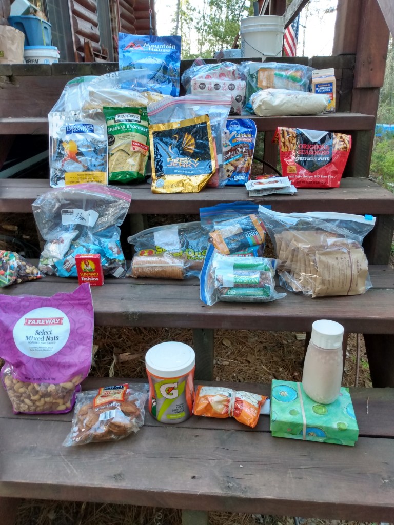 Lunches, on the other hand can be drawn out for hours. Conversely, sometimes we have two or three lunches in a day. It all depends on how tired and hungry we are. My personal lunch stash includes jerky, nuts, pumpkin seeds, crackers, peanut butter, leftover Easter candy, dried mango, pretzels, raisins, gorp, and Gatorade.