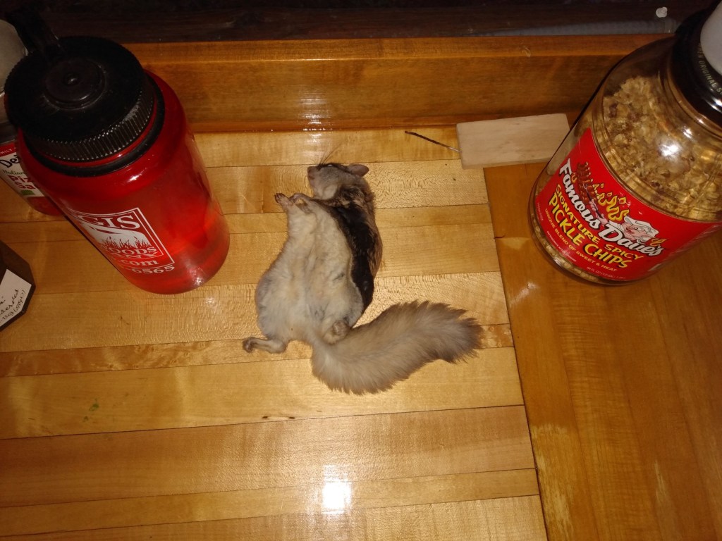 Our cabin has a summer kitchen. That means it is screened-in but is in no way watertight or varmint-proof. I had been having some problems with what I thought were mice eating foodstuffs left on the counter. The confusing part was that the evidence the critters left behind was much larger than mouse poop. I set some mouse traps but they kept disappearing. One day I came down to the kitchen and found a squirrel, flat on his back with his supplicating little paws up in the air, killed by a mouse trap.