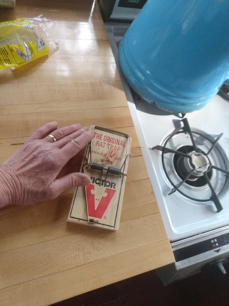 That was the end of the problem until earlier this summer. This time, something chewed through tin foil, plastic, Tupperware, the window screen, and my whole summer supply of granola. That was the last straw. My rodents were wilier than mousetraps, so I went to the hardware store to see what my other options were. All they had were little plastic houses that the mouse is supposed to go in, eat poison inside, and die there. The door in the trap was not nearly big enough for a squirrel. But my eyes soon alighted on a giant mouse trap billed as a rat trap! The perfect size for squirrels! I do not want to kill squirrels, but likewise I do not want them roaming around my kitchen eating whatever they please. So I set my giant rat trap, loaded it with peanut butter, and went to bed. At 1:00 in the morning I was awakened by someone knocking at the door. Knock knock knock. Knock knock knock. Who could it be? We live on an island accessible only by boat. Who would be boating around in the dark at 1:00 in the morning? Again knock knock, knock. I finally threw on a bathrobe and went downstairs with my flashlight. No one was at the door. No one was knocking. But there on the counter, in the rat trap, was the hunched form of a dead squirrel. He must have been in his death throes when I heard the trap knocking on the counter. Oh well. I was not going to deal with his corpse at 1:00 in the morning, so I trudged back to bed. As soon as I closed my eyes, knock, knock, knock. What in the world? I put on my bathroom again, grabbed my flashlight and went downstairs a second time. Nothing there but the squirrel in the rat trap. But this time I noticed his eyes were on me. The huge kill bar on the rat trap was over the squirrel’s neck, but his eyes were still tracking me. Okay, I thought. I will release him and at least he will quit throwing that trap around. I put on a pair of leather gloves and began to pull up the kill bar. Immediately the squirrel, released from the jaws of death, jumped up in the air and disappeared. I went back to bed. In the morning there were no further signs of squirrels. I reset the rat trap and we will see what I catch today.