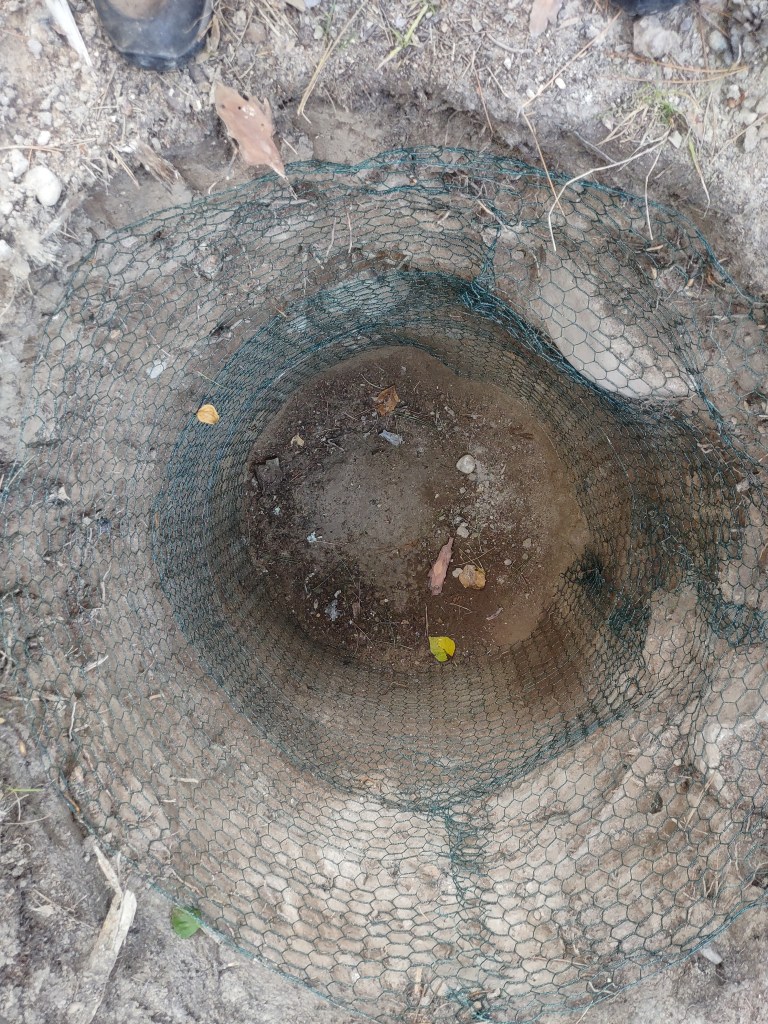 Sorry to leave you in the lurch concerning the progress of my outhouse. I finished the hole after about 12 hours of digging, spaced over a couple weeks. At that point I hit bedrock and decided the pit was deep enough at four and a half feet. It is about three and a half feet in diameter. I lined it with chicken wire, more for peace of mind than for any functional reason. The last time I climbed into the hole there were two frogs and two mice at the bottom, trapped like Joseph. I assisted them to freedom. Now, to move the outhouse itself.