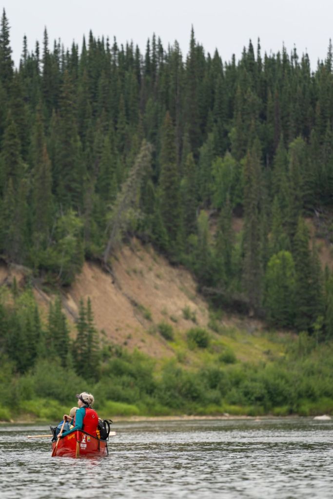 The next day the smoke returned, the wind was strong, and it rained all day. We kept getting stuck on gravel bars. There was a lot of maneuvering necessary to stay in the proper channel. These shallow areas were interspersed with rapids so we had to pay attention all the time. People were beginning to get tired after a week of constant paddling with little down time. My shoulders felt like they weren’t even attached to my body anymore. It’s like I had free floating joints. I borrowed painkillers from all my friends. We spotted three moose making their way across the river ahead of us, shambling through the shallows.